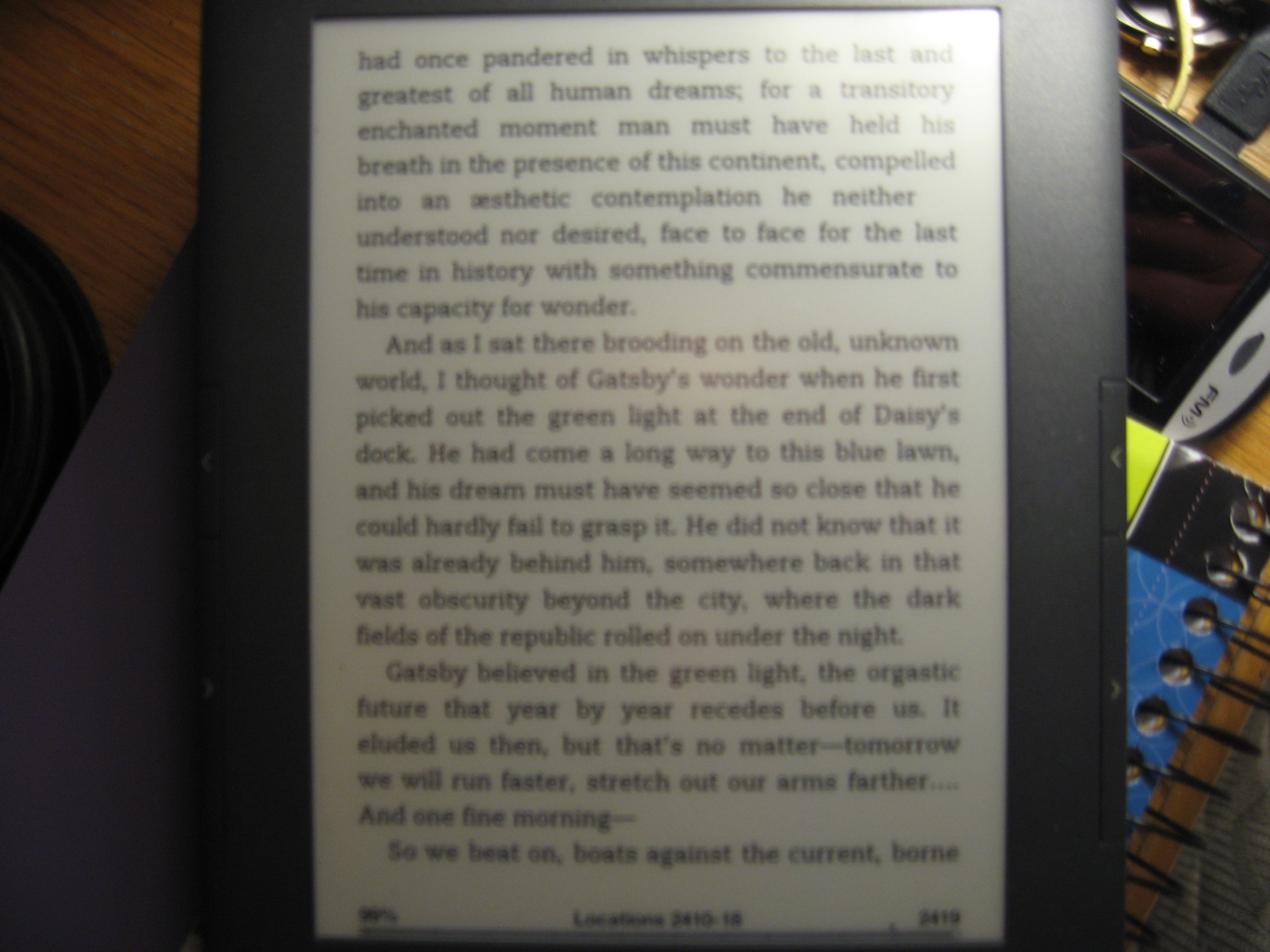 As a student of books, and at the present moment taking a course on book design, I inherently appreciate the beauty of a printed tome. I also grudgingly admit that though I'm enjoying the Kindle it could use some work in the aesthetic department. It was only when I got to the last page of classic Fitzgerald when I was able to put a finger on why.